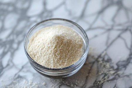 High-angle view of a glass bowl filled with fine semolina flour on a marble countertop