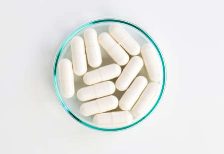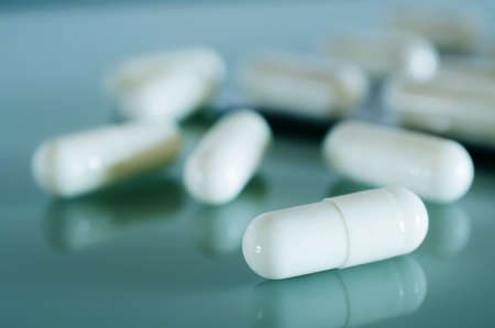 Close up of medical capsules on white background