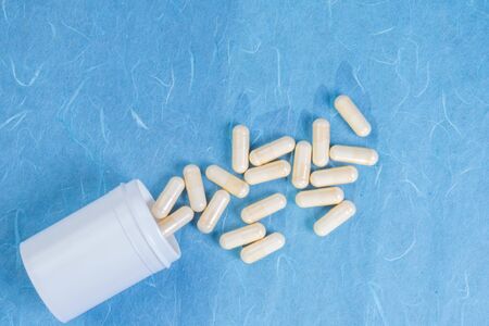Heap of medical pills from white bottle on a blue background
