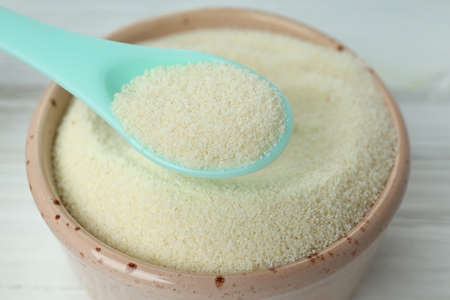 Close up of baby milk powder and spoon on tile background.