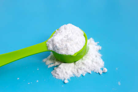 Baking soda on blue background.
