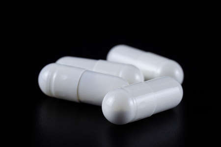 White capsules with medicine on a black background.