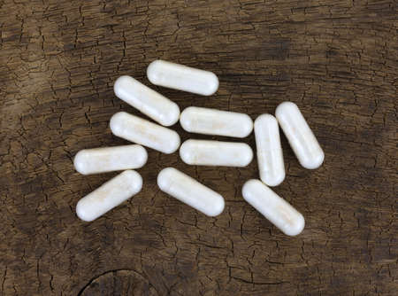 many capsule pill on wooden background