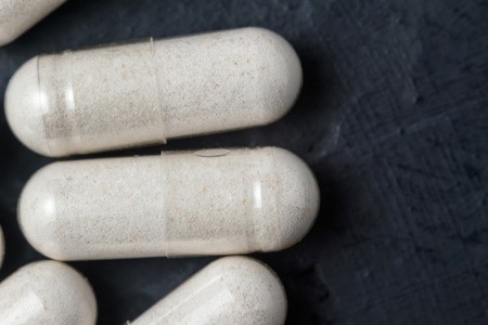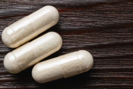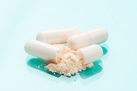 White medicine capsules probiotic powder inside. Close up. High resolution product. Health care concept