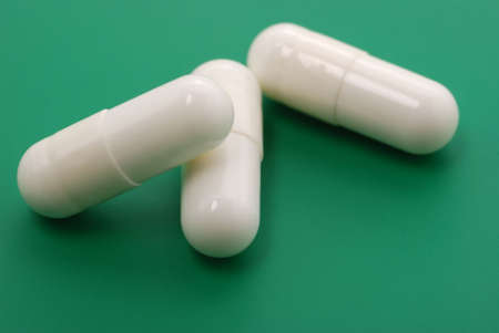 white tablets at green background. A medical preparation in the form of capsules