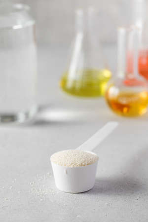 A scoop with hydrolyzed collagen powder against the background of laboratory flasks. Food additives, healthy.