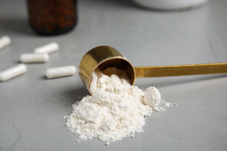 Amino acid powder and scoop on gray table