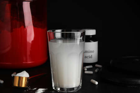 sports supplement creatine powder on black background copy space