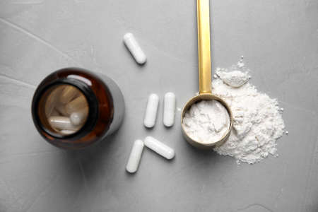 Amino acid pills and powder on gray table, flat lay