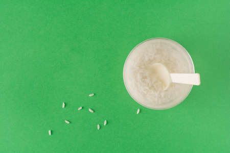 Jar of rice water for skin care face cleansing cosmetic product. Holistic beauty concept, fermented beauty care trend