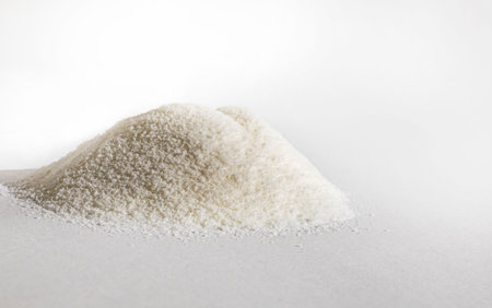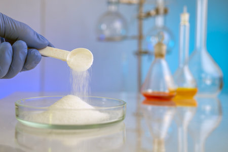 Hydrolyzed Collagen Powder, in the laboratory, pharmaceutical product for use in the food industry, isolated background and copyspace