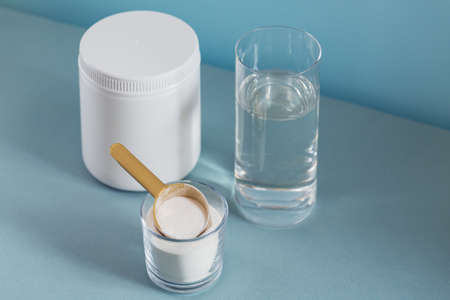 Glass with collagen dissolved in water and collagen protein powder on light blue table. Healthy lifestyle concept.