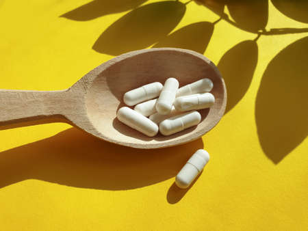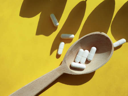 White pills or capsules in a plastic spoon, medication treatment, alternative medicine, close-up view.