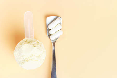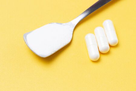 Collagen powder in a spoon and three white capsules on yellow