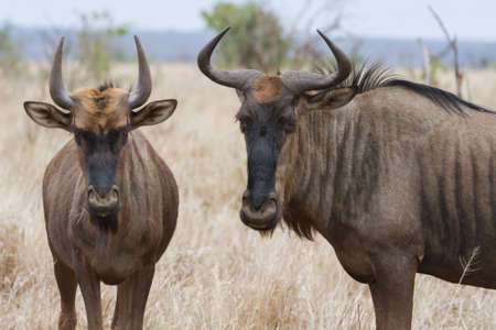 Closeup pair of Blue Wildebeest (gnu) looking annoyed and bothered with bokeh in Kruger, South Africa