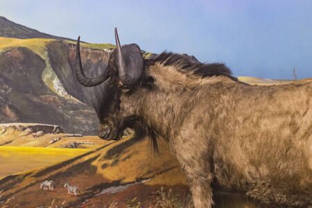 Wildebeest is standing in the tall, dry grass of the african savanna