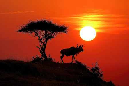 A wildebeest standing on a hilltop against a dramatic sunset