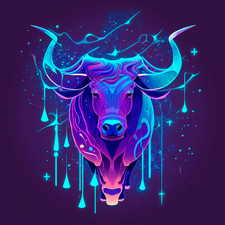 A digital illustration presents a powerful bull, illuminated with vibrant neon colors against a dark background. The artwork features dynamic lighting and visual effects, creating a dramatic atmosphere. This image could be used for various commercial projects, including advertising or editorial content, emphasizing themes of strength.