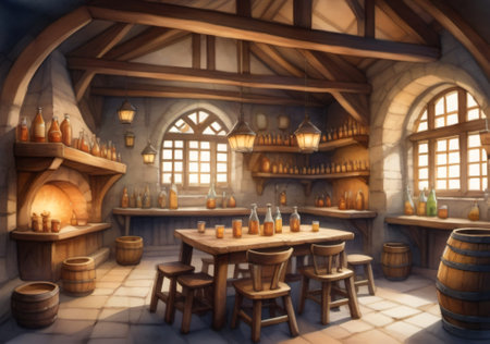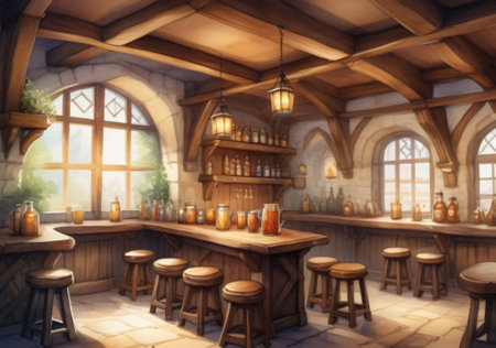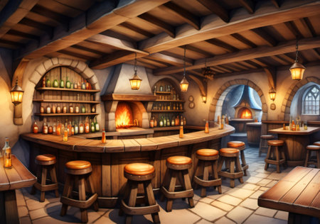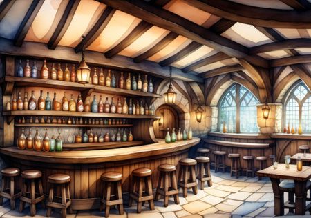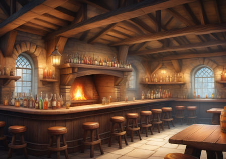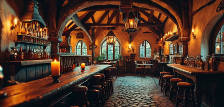 Photo Of Wide Panoramic View Of The Bar Area In A Fantasy Medieval Tavern, Interior, Art Illustration. Generative AI