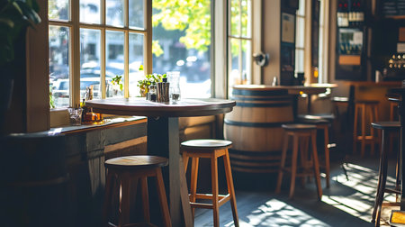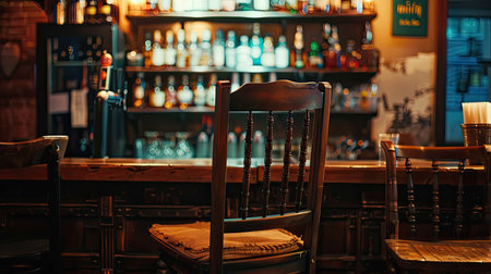 Interior of a pub with bar chairs and tables, vintage style