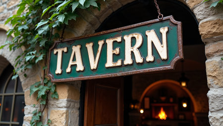 Vintage Tavern sign on stone wall with ivy wooden door and inviting pub interior