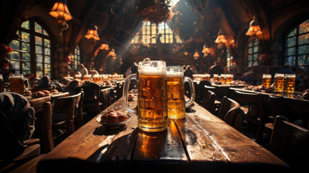 Beer mugs with fresh pretzels or brezen at Oktoberfest, Munich, Germany, Generative AI