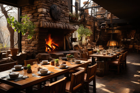 Luxury restaurant interior with fireplace and wooden tables, nobody inside