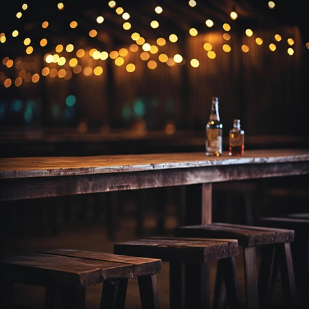 Real wood table and people with light reflection on scene at restaurant, pub or bar at night. Blurred background for product display or montage your products with several concept idea and any occasion.