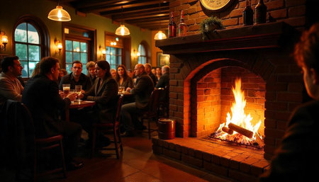 Cozy Pub Interior with Fireplace and People Gathered Around