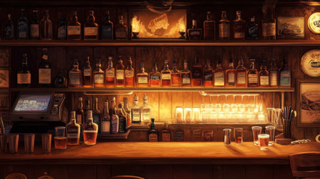 A cozy bar scene with an array of whiskey bottles and glasses on shelves, creating a warm, inviting ambiance.