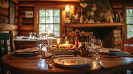 A serene setting featuring a cozy cabin with a hearty Northern meal prepared on the table, inviting guests to sit down and enjoy.
