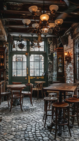 Charming old-fashioned tavern with a cobblestone floor, wooden tables, and a vintage chandelier, offering a historic aesthetic