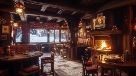 The inviting atmosphere of a rustic restaurant showcases wooden tables and a warm fireplace, perfectly complementing the snowy backdrop outside.