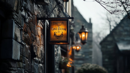 A weathered wooden tavern sign dangles from a wrought iron bracket, illuminated by warm lantern light, set against a backdrop of ancient stone walls in a quaint village.
