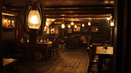 The cozy atmosphere of a rustic pub is highlighted by wooden tables, warm candlelight, and vintage decor, creating a welcoming space for patrons to relax.
