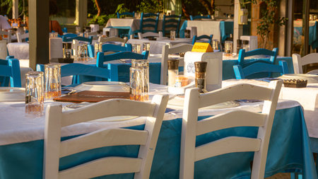 Athens, Greece. Greek traditional tavern empty tables and chairs outdoors at Plaka.