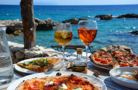 Pizza and drinks by the sea