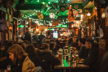 Saint Patrick's day celebration, people drinking beer in decorated Irish pub