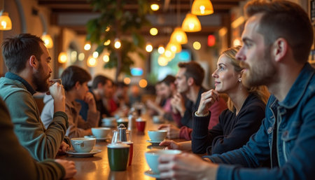 A cozy coffee shop corner with wooden tables, warm lighting, and people chatting in a relaxed atmosphere.