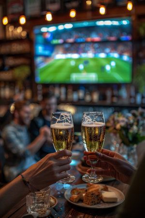 Group of Sport fans are holding up their champagne glasses to celebrate while team winning