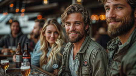 Group of friends having a beer together at a pub, smiling.