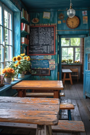The interior of a modern school room. A class for students.