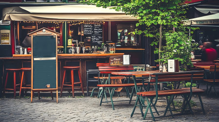 Empty outdoor cafe with wooden tables and chairs, chalkboard menu, and greenery, creating a cozy European street atmosphere.