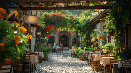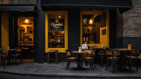 Sunny outdoor cafe autumn morning empty tables cozy atmosphere string lights tree lined street inviting peaceful urban setting