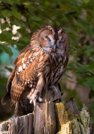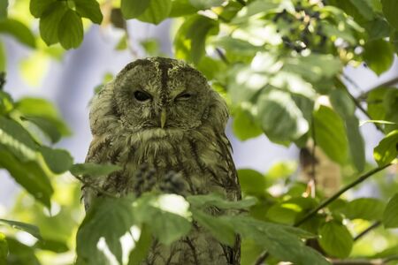Closeup portrait of a tawny owl or brown owl (Strix aluco), winking his eye. These owls are commonly found in woodlands.