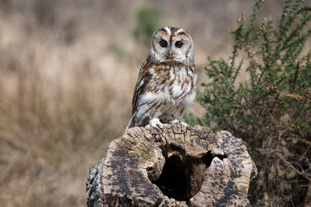 A tawny owl portrait as it is perched on an old tree stump. It is staring forward