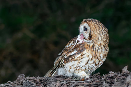 A close up profile photo taken from low level of a tawny owl at night. It is standing on the floor with a small rodent in its beak and looking over its shoulder