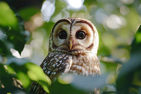 Close-up portrait of a barred owl peeking through green leaves in its natural habitat, showing its captivating gaze and intricate plumage