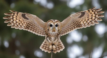 A tawny owl is captured in mid-flight, its wings fully spread, showcasing intricate patterns of brown, white, and black feathers. Its large, dark eyes are focused forward, conveying intense concentration. The background is softly blurred, highlighting the owl as the central subject.