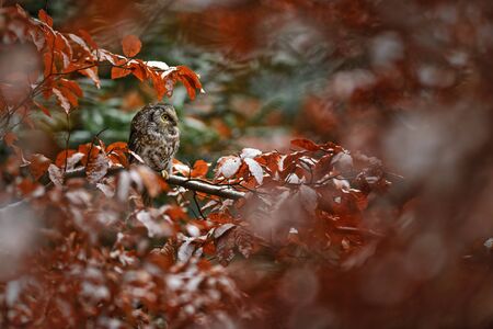 Strix aluco. Wild nature. Beautiful owl photo. Autumn nature of Czech. Beautiful colors in the photo. Bird on the photo. A rare bird.He lives in Europe, except for northern areas. Owl in the snowy for